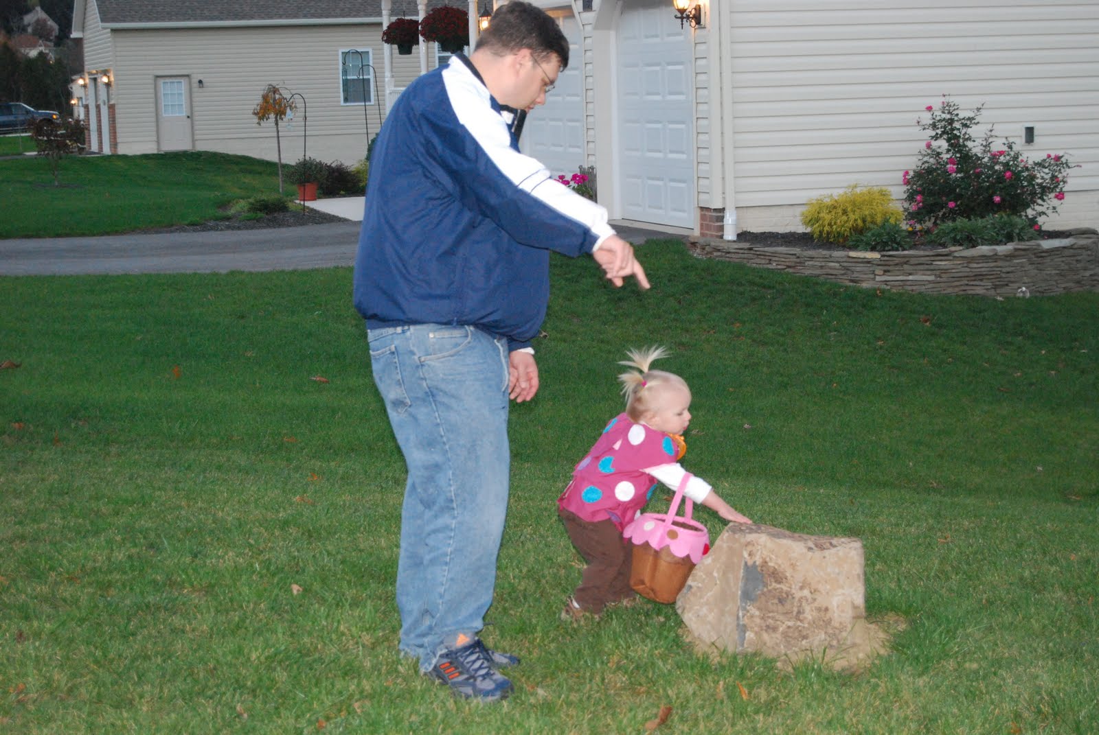 At the second house Kaitlyn hadn't yet gotten the concept of trick-or-treating and figured why not play with the big rock (don't worry, she figured it out.... "trich tree")